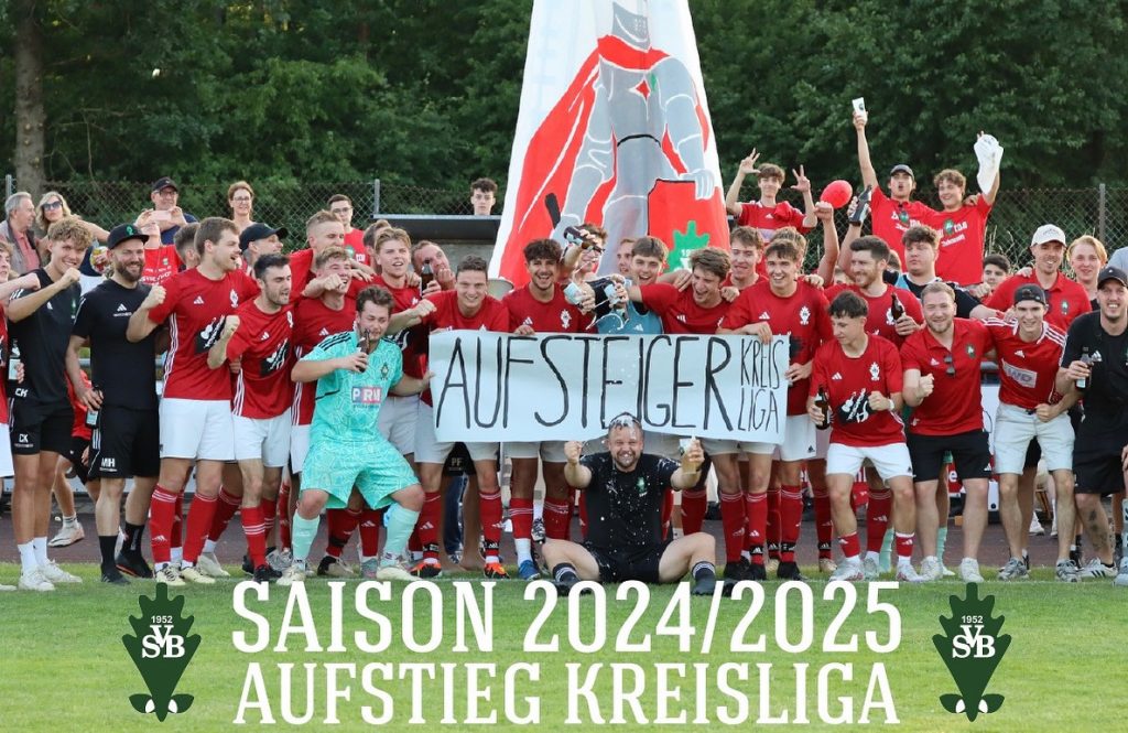 Der SV Bubenreuth gratuliert seiner 1. Mannschaft zum Aufstieg in die Kreisliga! Nach schwierigem Start in die Saison 2024/2025 hatte die Mannschaft zum Ende der Hinrunde in der Kreisklasse 1 immerhin 8 Punkte Rückstand auf den Relegationsplatz. Die Mannschaft glaubte dennoch an einen möglichen Aufstieg. Mit einer tollen Aufholjagd – die Mannschaft blieb die letzten 15 Spiele ungeschlagen und holte ab dem 18. Spieltag sogar neun Siege in Folge. Am letzten Spieltag verdrängte man den FSV Erlangen-Bruck 2 vom 2. Tabellenplatz. In der Relegation musste man 2 Spiele gewinnen, um den ersehnten Aufstieg in die Kreisliga zu erreichen! Im ersten Spiel schlug man den BSC Erlangen in Forth mit 1:0 und zog in das 2te Spiel ein. Hier traf man auf den ATSV Erlangen 2. Nach 90 spannenden Minuten in Langensendelbach gewannen die Bubenreuther Jungs 2:0! Damit war der Aufstieg in die Kreisliga perfekt.