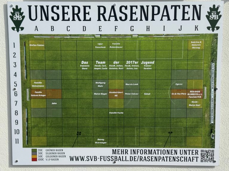 Ihr müsst „Euer“ Rasenstück weder düngen noch mähen – die Einnahmen der Aktion „Rasenpate“ fließen zu 100 % in die Platzpflege unserer Sportanlagen. Selbstverständlich dürft Ihr Euch den Platz Eurer Parzelle/n selbst aussuchen, sofern dieser noch nicht belegt ist.